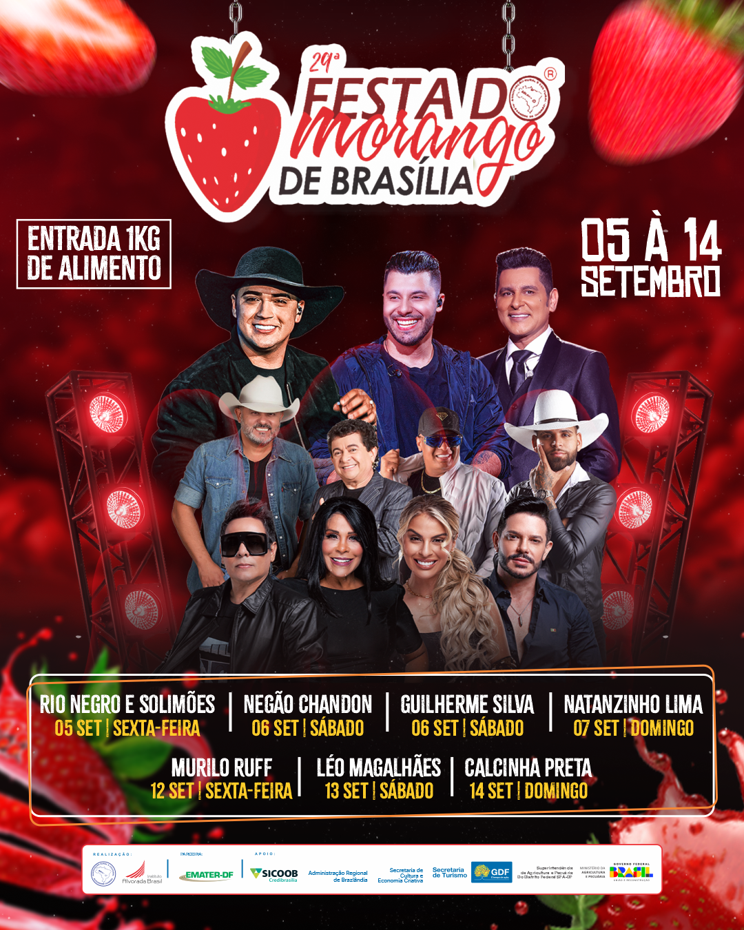 A 29ª edição da tradicional Festa do Morango de Brasília já tem data marcada! O evento será realizado em Brazlândia nos dias 5 a 7 e 12 a 14 de setembro, consolidando-se como parte do calendário oficial do Distrito Federal e do coração dos brasilienses.